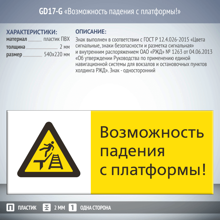 Знак «Возможность падения с платформы!», GD17-G (односторонний горизонтальный, 540х220 мм, пластик 2 мм) в Ижевске купить