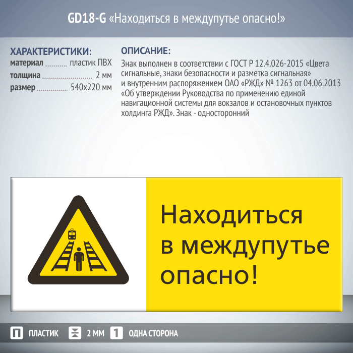 Знак «Находиться в междупутье опасно!», GD18-G (односторонний горизонтальный, 540х220 мм, пластик 2 мм) в Ижевске купить