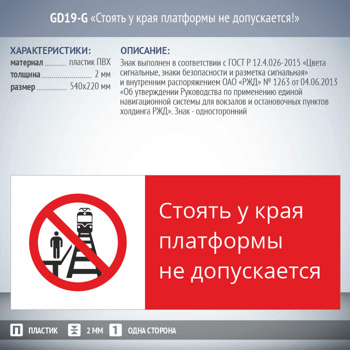 Знак «Стоять у края платформы не допускается!», GD19-G (односторонний горизонтальный, 540х220 мм, пластик 2 мм) в Ижевске купить