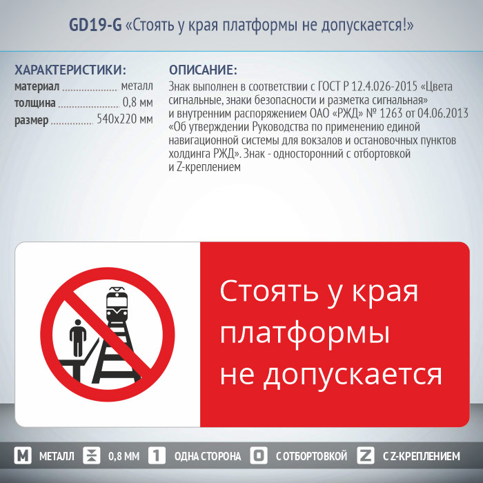 Знак «Стоять у края платформы не допускается!», GD19-G (односторонний горизонтальный, 540х220 мм, металл, с отбортовкой и Z-креплением) в Ижевске купить