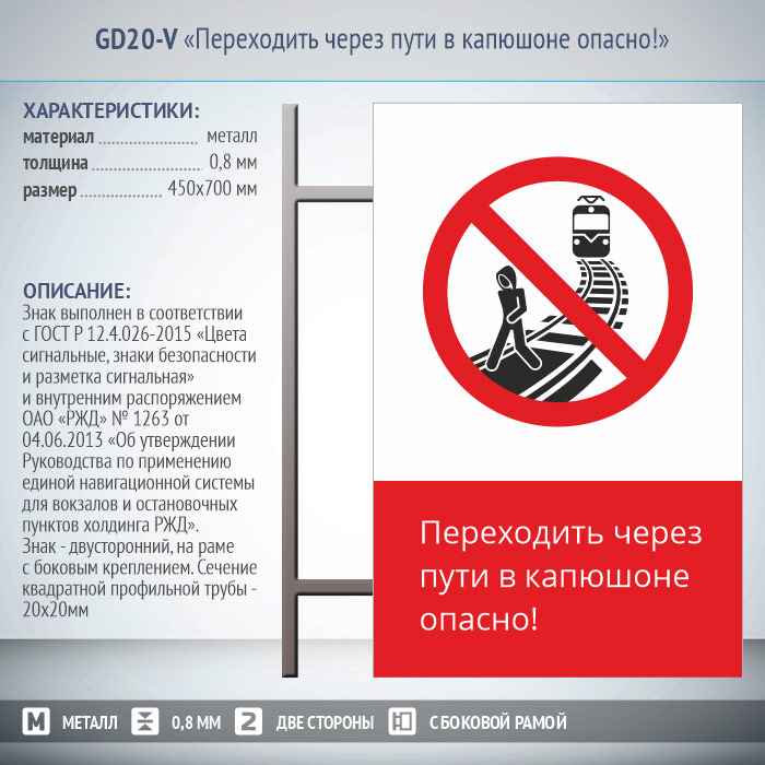 Знак «Переходить через пути в капюшоне опасно!», GD20-V (двусторонний вертикальный, 450х700 мм, металл, на раме с боковым креплением) в Ижевске купить