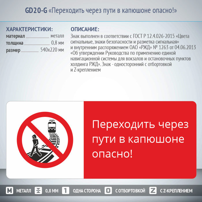 Знак «Переходить через пути в капюшоне опасно!», GD20-G (односторонний горизонтальный, 540х220 мм, металл, с отбортовкой и Z-креплением) в Ижевске купить