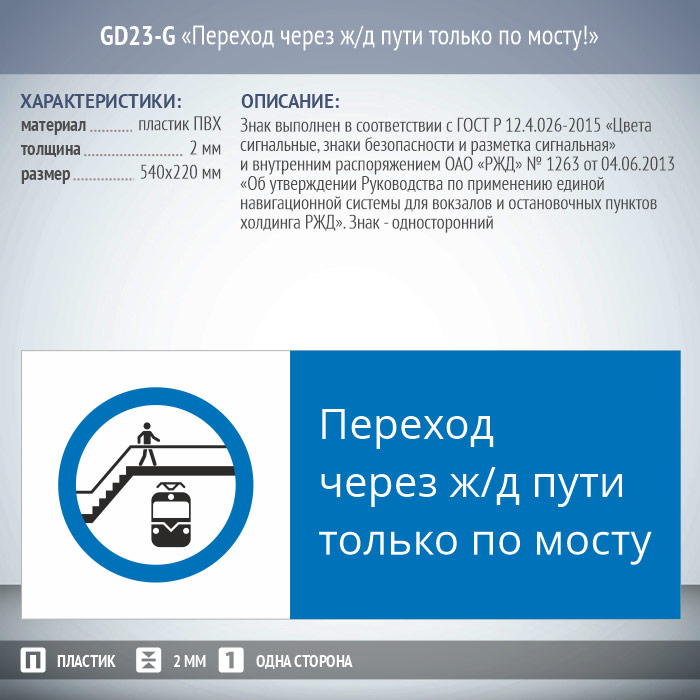 Знак «Переход через ж/д пути только по мосту!», GD23-G (односторонний горизонтальный, 540х220 мм, пластик 2 мм) в Ижевске купить
