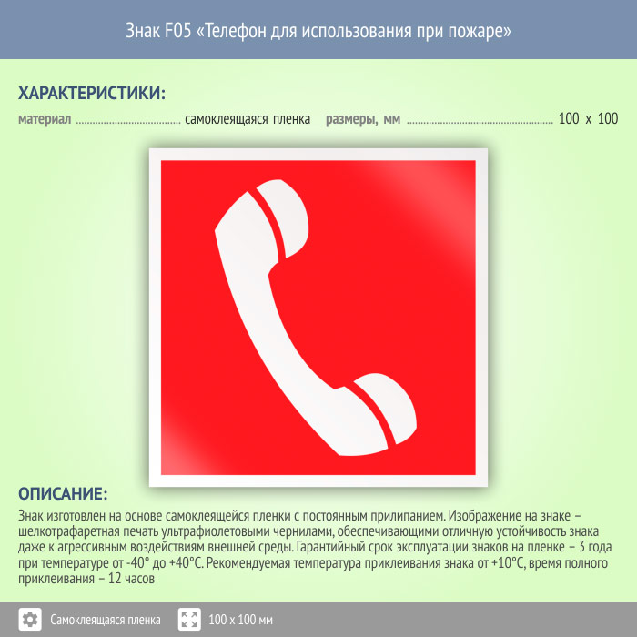 Знак F05 «Телефон для использования при пожаре (в том числе телефон прямой связи с пожарной охраной)» (пленка, 100х100 мм) в Ижевске купить