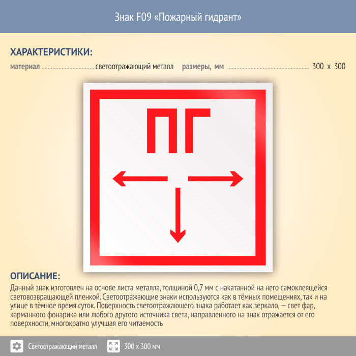 Знак F09 «Пожарный гидрант» (светоотражающий металл, 300х300 мм) в Ижевске купить