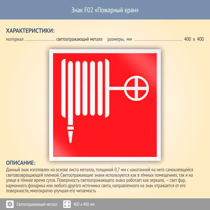 Знак F02 «Пожарный кран» (светоотражающий металл, 400х400 мм) в Ижевске купить
