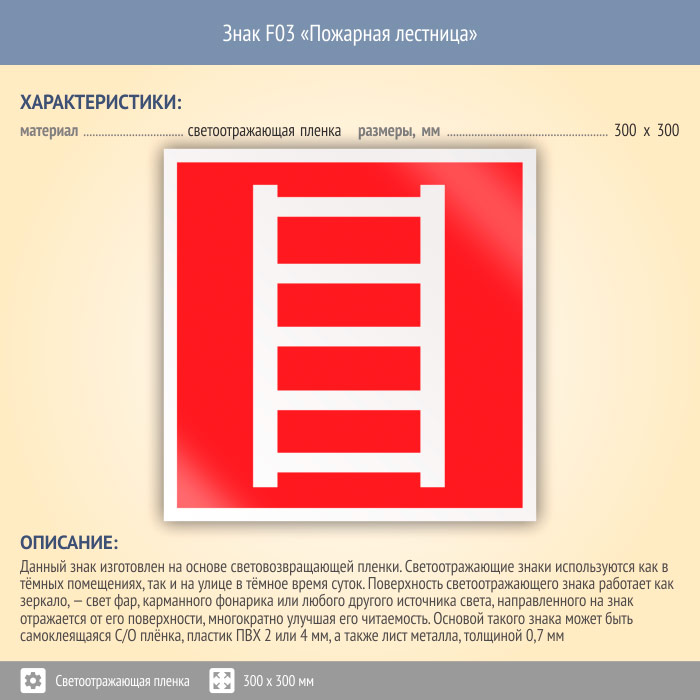Знак F03 «Пожарная лестница» (светоотражающая пленка, 300х300 мм) в Ижевске купить