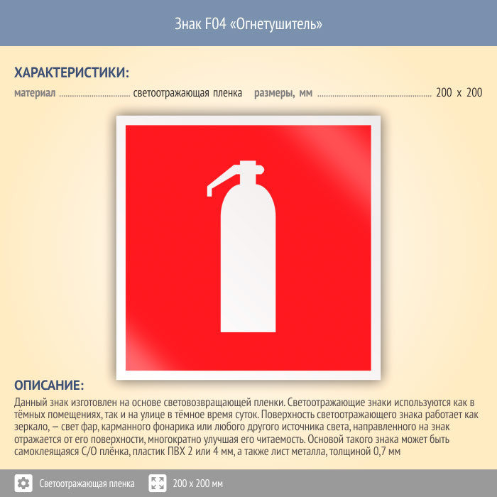 Знак F04 «Огнетушитель» (светоотражающая пленка, 200х200 мм) в Ижевске купить