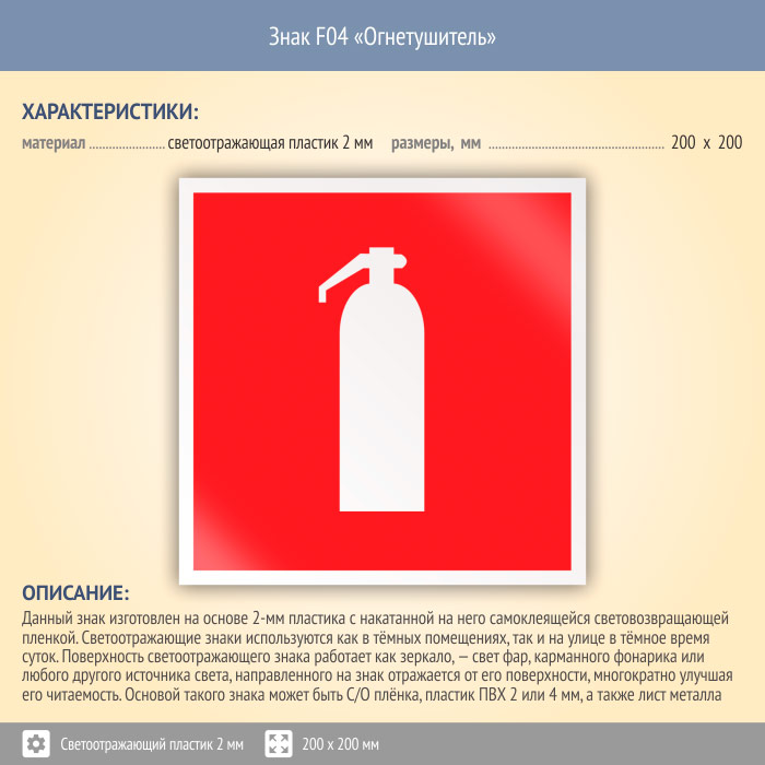 Знак F04 «Огнетушитель» (светоотражающий пластик, 200х200 мм) в Ижевске купить