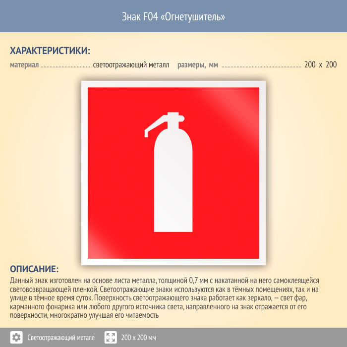 Знак F04 «Огнетушитель» (светоотражающий металл, 200х200 мм) в Ижевске купить