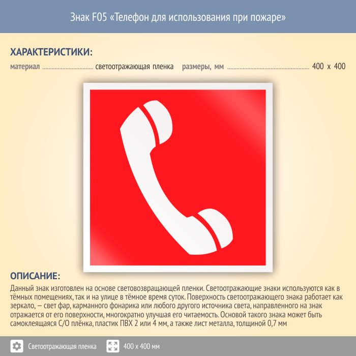 Знак F05 «Телефон для использования при пожаре (в том числе телефон прямой связи с пожарной охраной)» (светоотражающая пленка, 400х400 мм) в Ижевске купить