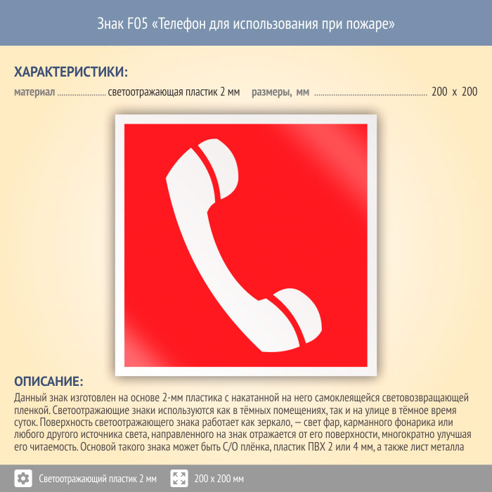 Знак F05 «Телефон для использования при пожаре (в том числе телефон прямой связи с пожарной охраной)» (светоотражающий пластик, 200х200 мм) в Ижевске купить