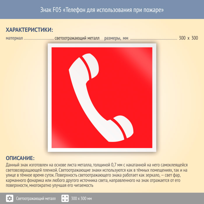 Знак F05 «Телефон для использования при пожаре (в том числе телефон прямой связи с пожарной охраной)» (светоотражающий металл, 300х300 мм) в Ижевске купить