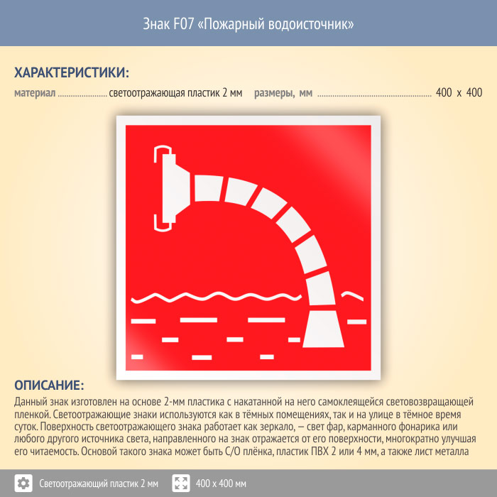 Знак F07 «Пожарный водоисточник» (светоотражающий пластик, 400х400 мм) в Ижевске купить