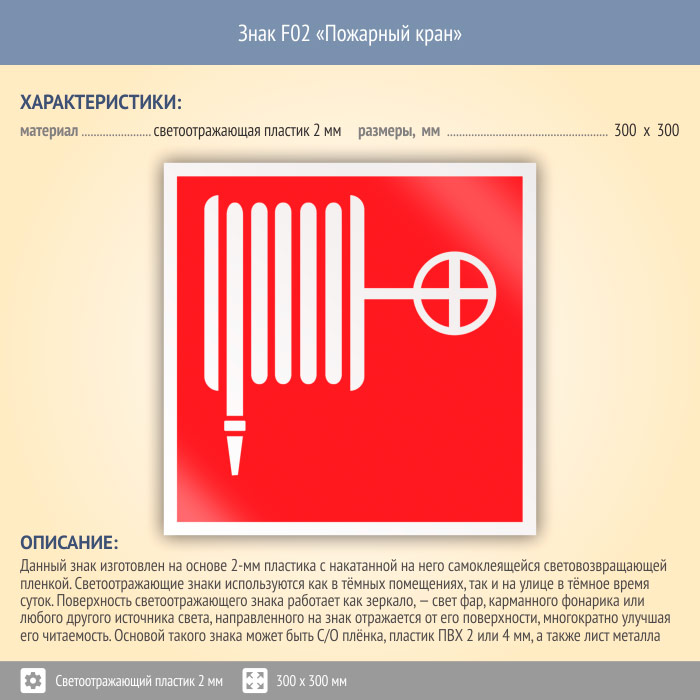 Знак F02 «Пожарный кран» (светоотражающий пластик, 300х300 мм) в Ижевске купить