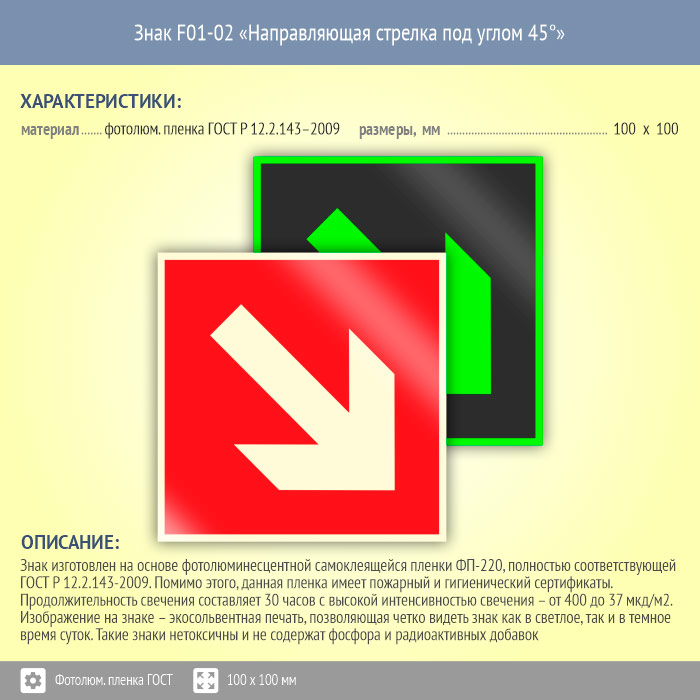 Знак F01-02 «Направляющая стрелка под углом 45°» (фотолюминесцентная пленка ГОСТ 34428-2018, 100х100 мм) в Ижевске купить