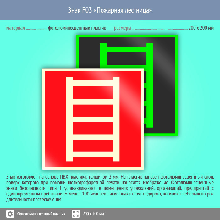 Знак F03 «Пожарная лестница» (фотолюминесцентный пластик, 200х200 мм) в Ижевске купить