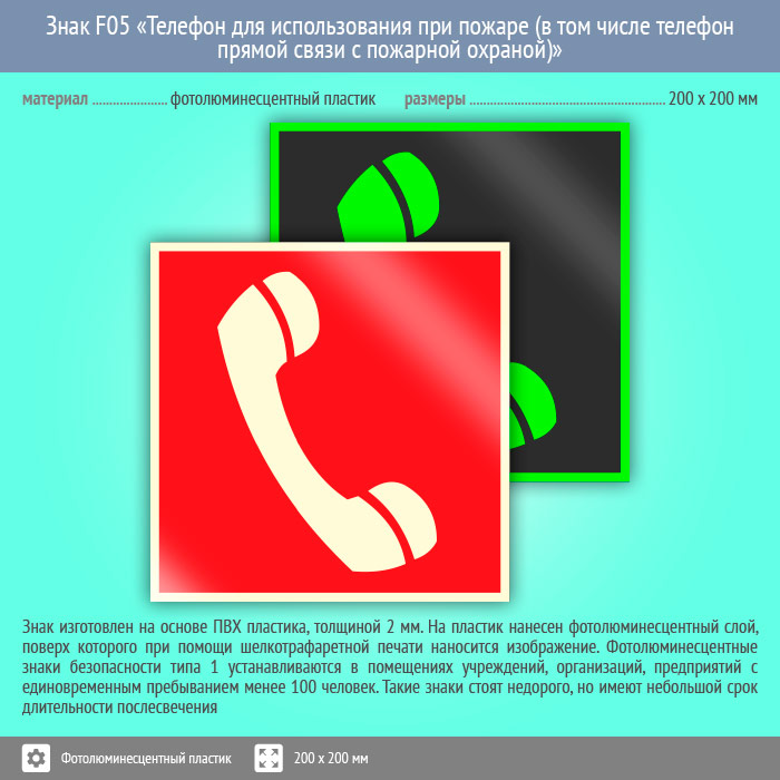 Знак F05 «Телефон для использования при пожаре (в том числе телефон прямой связи с пожарной охраной)» (фотолюминесцентный пластик, 200х200 мм) в Ижевске купить