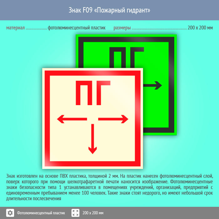 Знак F09 «Пожарный гидрант» (фотолюминесцентный пластик, 200х200 мм) в Ижевске купить