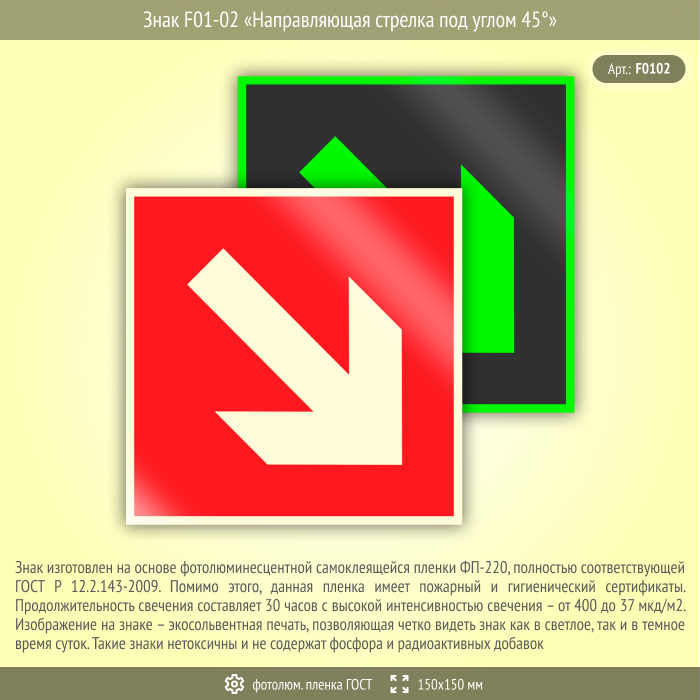 Знак F01-02 «Направляющая стрелка под углом 45°» (фотолюминесцентная пленка ГОСТ 34428-2018, 150х150 мм) в Ижевске купить