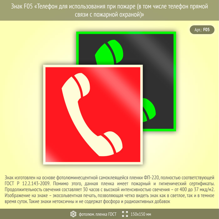 Знак F05 «Телефон для использования при пожаре (в том числе телефон прямой связи с пожарной охраной)» (фотолюминесцентная пленка ГОСТ 34428-2018, 150х150 мм) в Ижевске купить