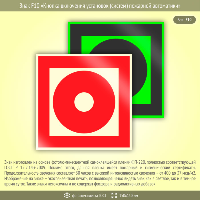 Знак F10 «Кнопка включения установок (систем) пожарной автоматики» (фотолюминесцентная пленка ГОСТ 34428-2018, 150х150 мм) в Ижевске купить