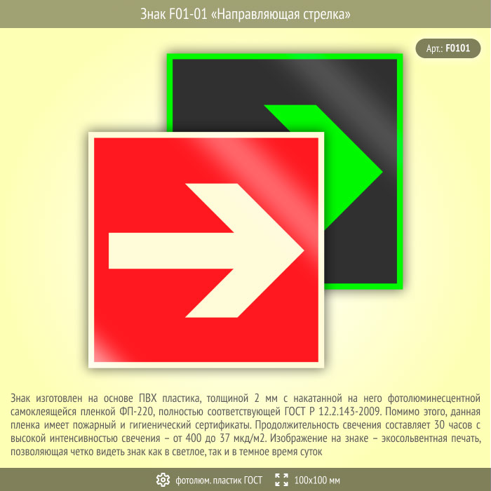 Знак F01-01 «Направляющая стрелка» (фотолюминесцентный пластик ГОСТ 34428-2018, 100х100 мм) в Ижевске купить