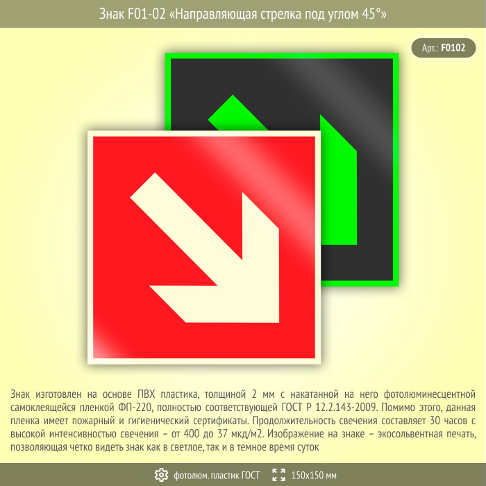 Знак F01-02 «Направляющая стрелка под углом 45°» (фотолюминесцентный пластик ГОСТ 34428-2018, 150х150 мм) в Ижевске купить