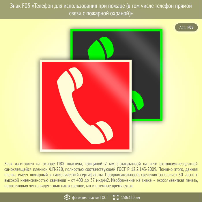 Знак F05 «Телефон для использования при пожаре (в том числе телефон прямой связи с пожарной охраной)» (фотолюминесцентный пластик ГОСТ 34428-2018, 150х150 мм) в Ижевске купить
