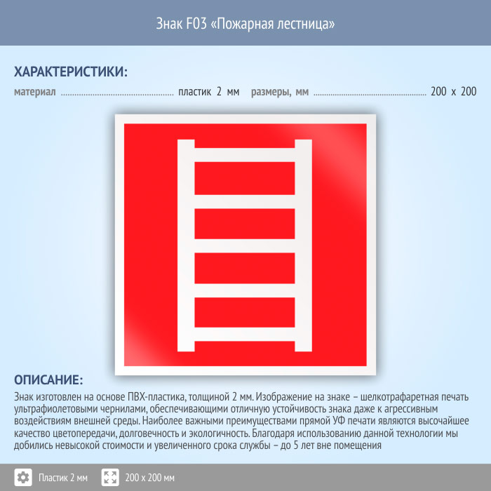 Знак F03 «Пожарная лестница» (пластик, 200х200 мм) в Ижевске купить