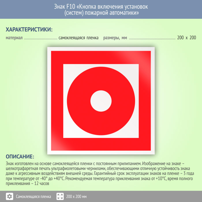 Знак F10 «Кнопка включения установок (систем) пожарной автоматики» (пленка, 200х200 мм) в Ижевске купить