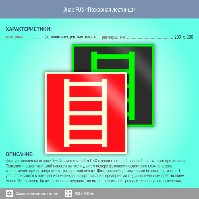 Знак F03 «Пожарная лестница» (фотолюминесцентная пленка, 200х200 мм) в Ижевске купить