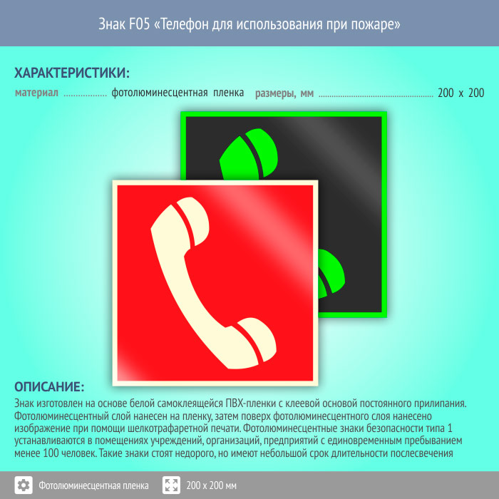 Знак F05 «Телефон для использования при пожаре (в том числе телефон прямой связи с пожарной охраной)» (фотолюминесцентная пленка, 200х200 мм) в Ижевске купить