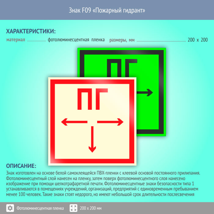 Знак F09 «Пожарный гидрант» (фотолюминесцентная пленка, 200х200 мм) в Ижевске купить