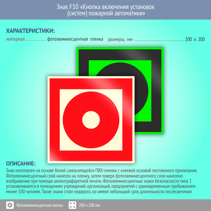 Знак F10 «Кнопка включения установок (систем) пожарной автоматики» (фотолюминесцентная пленка, 200х200 мм) в Ижевске купить