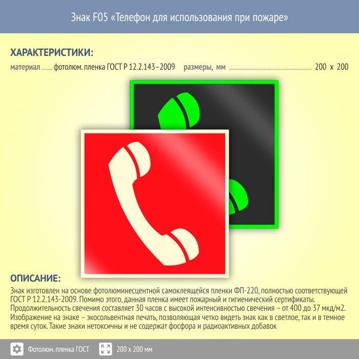 Знак F05 «Телефон для использования при пожаре (в том числе телефон прямой связи с пожарной охраной)» (фотолюминесцентная пленка ГОСТ 34428-2018, 200х200 мм) в Ижевске купить
