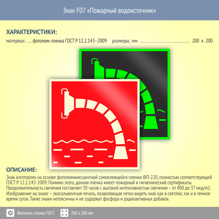 Знак F07 «Пожарный водоисточник» (фотолюминесцентная пленка ГОСТ 34428-2018, 200х200 мм) в Ижевске купить