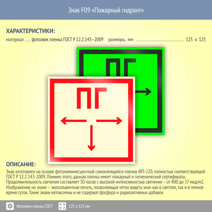 Знак F09 «Пожарный гидрант» (фотолюминесцентная пленка ГОСТ 34428-2018, 125х125 мм) в Ижевске купить