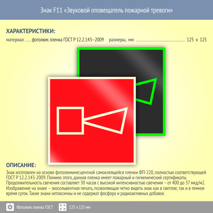 Знак F11 «Звуковой оповещатель пожарной тревоги» (фотолюминесцентная пленка ГОСТ 34428-2018, 125х125 мм) в Ижевске купить