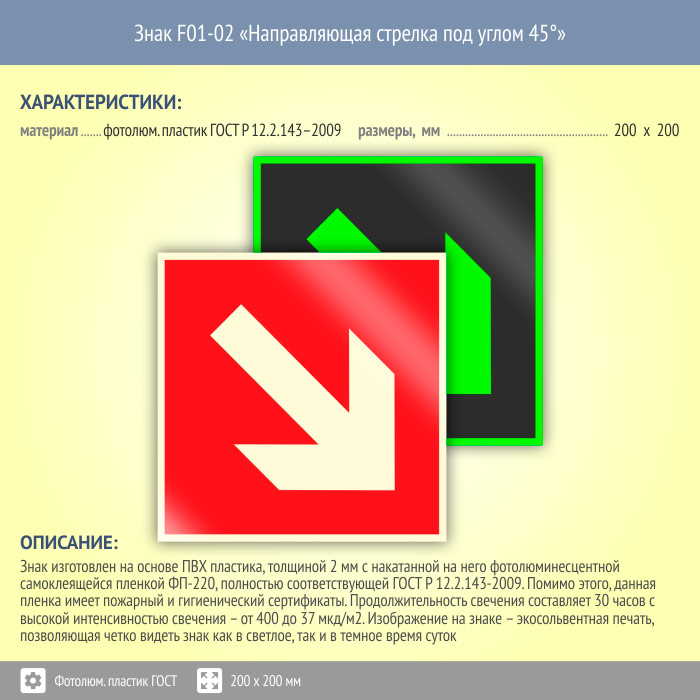 Знак F01-02 «Направляющая стрелка под углом 45°» (фотолюминесцентный пластик ГОСТ 34428-2018, 200х200 мм) в Ижевске купить