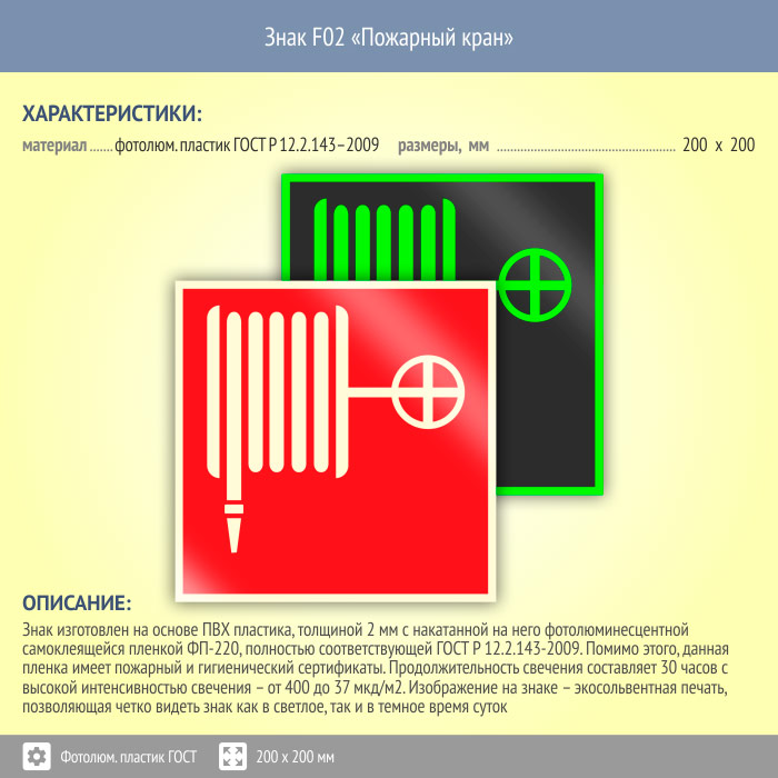 Знак F02 «Пожарный кран» (фотолюминесцентный пластик ГОСТ 34428-2018, 200х200 мм) в Ижевске купить