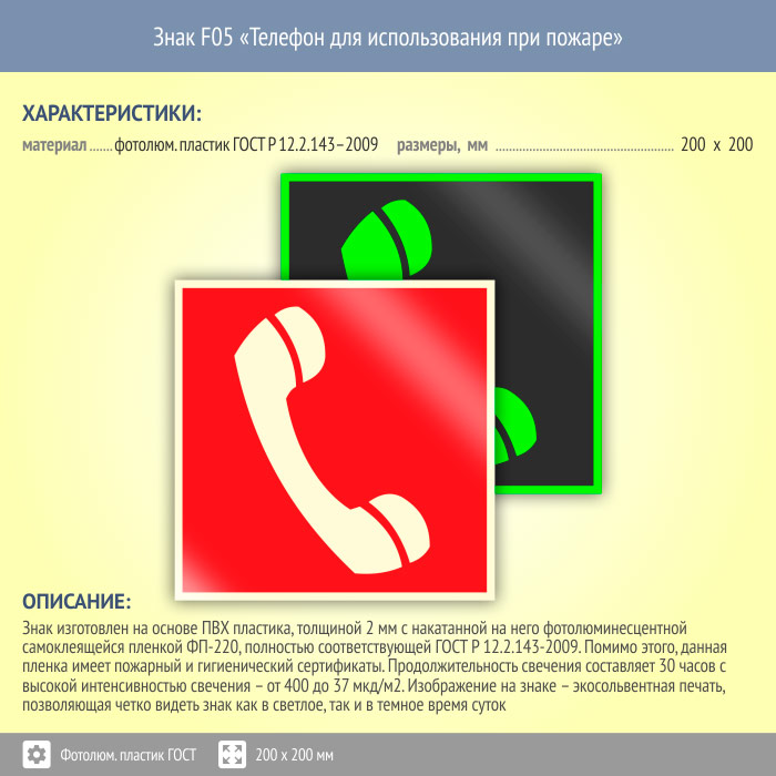 Знак F05 «Телефон для использования при пожаре (в том числе телефон прямой связи с пожарной охраной)» (фотолюминесцентный пластик ГОСТ 34428-2018, 200х200 мм) в Ижевске купить