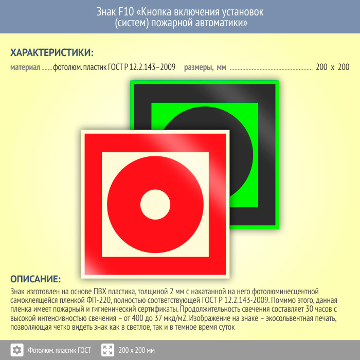 Знак F10 «Кнопка включения установок (систем) пожарной автоматики» (фотолюминесцентный пластик ГОСТ 34428-2018, 200х200 мм) в Ижевске купить