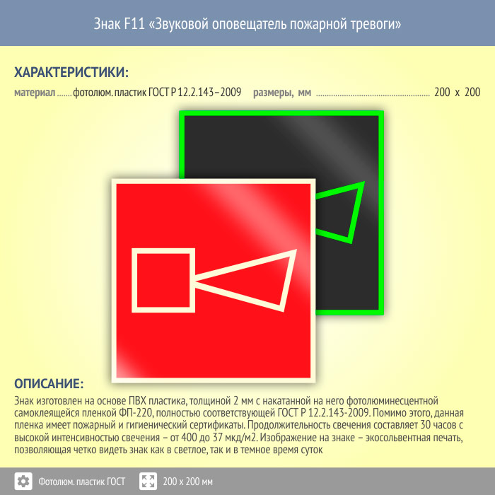 Знак F11 «Звуковой оповещатель пожарной тревоги» (фотолюминесцентный пластик ГОСТ 34428-2018, 200х200 мм) в Ижевске купить