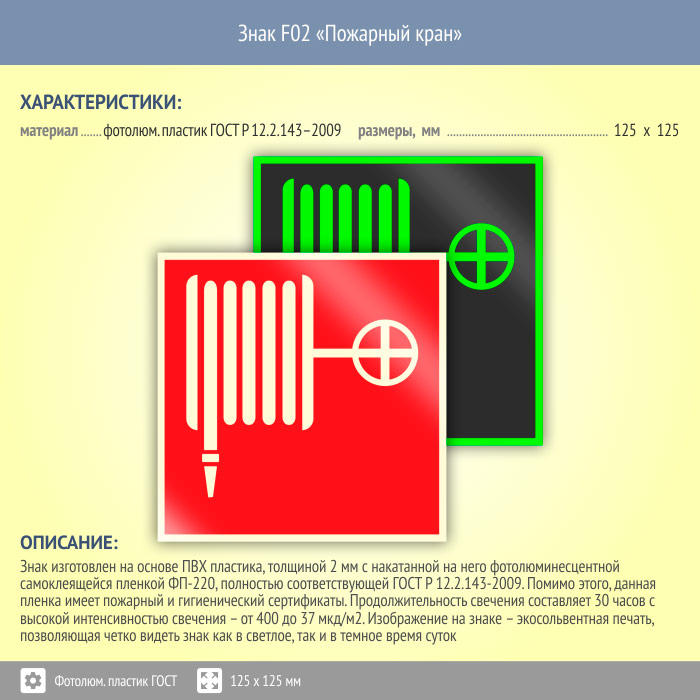 Знак F02 «Пожарный кран» (фотолюминесцентный пластик ГОСТ 34428-2018, 125х125 мм) в Ижевске купить