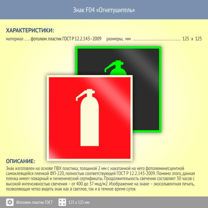 Знак F04 «Огнетушитель» (фотолюминесцентный пластик ГОСТ 34428-2018, 125х125 мм) в Ижевске купить