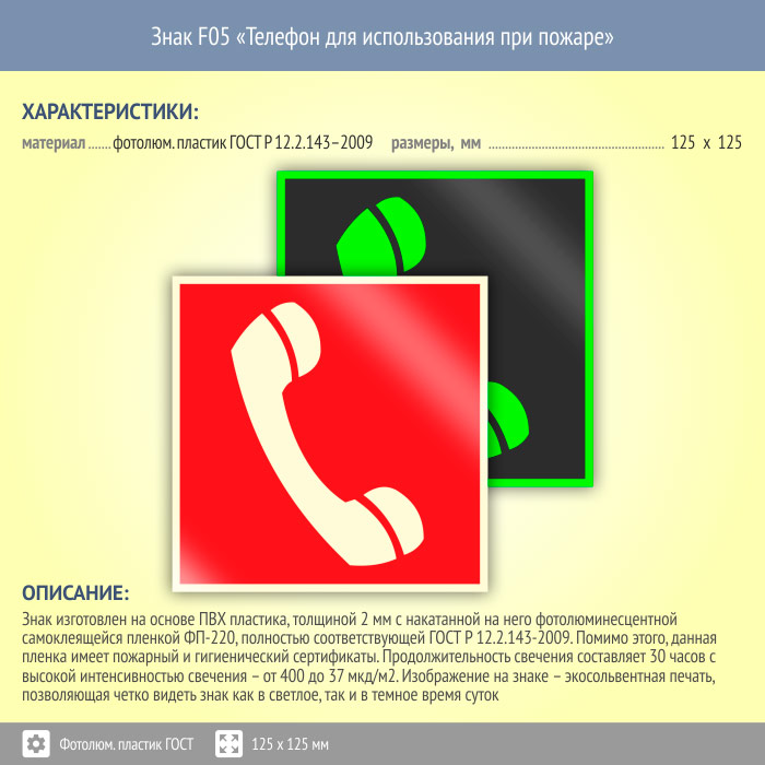 Знак F05 «Телефон для использования при пожаре (в том числе телефон прямой связи с пожарной охраной)» (фотолюминесцентный пластик ГОСТ 34428-2018, 125х125 мм) в Ижевске купить