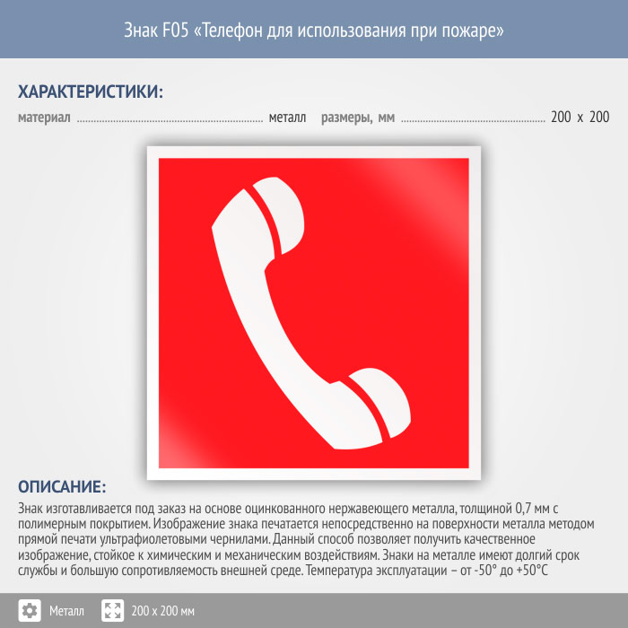 Знак F05 «Телефон для использования при пожаре (в том числе телефон прямой связи с пожарной охраной)» (металл, 200х200 мм) в Ижевске купить