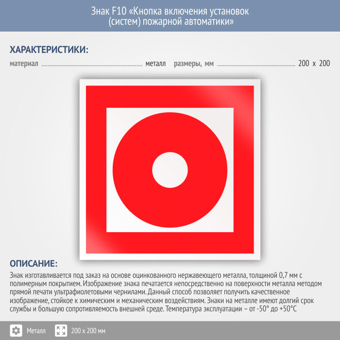 Знак F10 «Кнопка включения установок (систем) пожарной автоматики» (металл, 200х200 мм) в Ижевске купить
