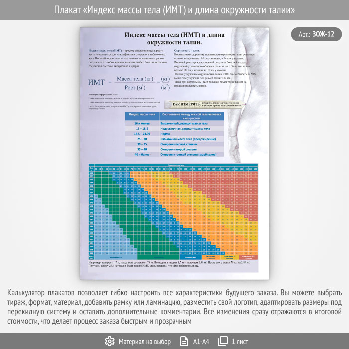 Плакат «Индекс массы тела (ИМТ) и длина окружности талии» (ЗОЖ-12, 1 лист) в Ижевске купить